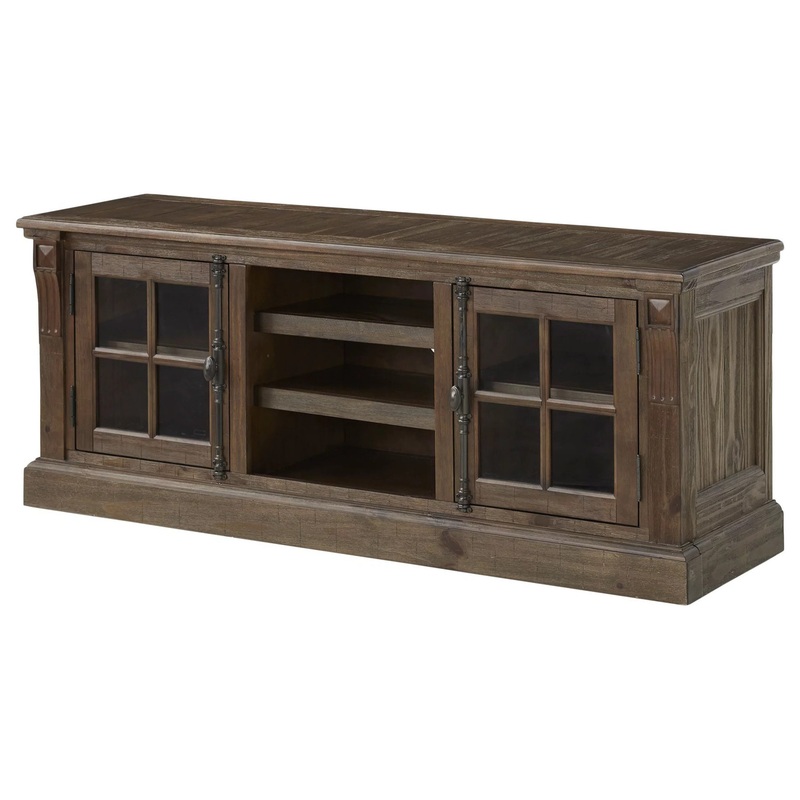 -Includes one (1) TV stand -Warm, brown, wire-brushed finish -Windowpane glass cabinet doors -Two (2) cabinets -Each cabinet comes with one (1) center shelf -Three (3) open shelves -Cutout holes for cable wire management -Made with pine and MDF -Ships in o