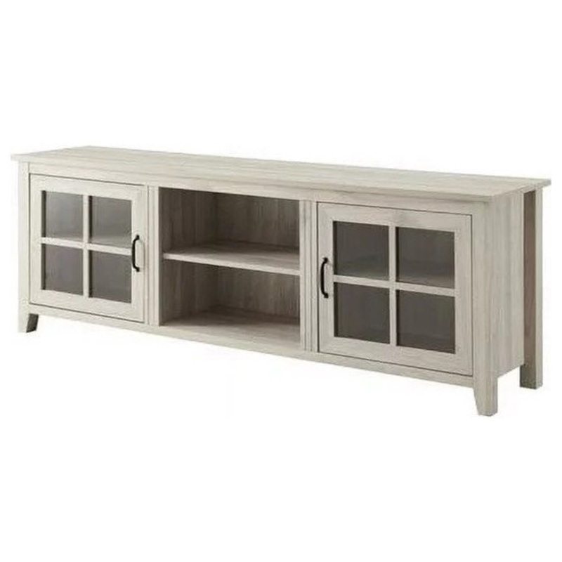 -Mixing transitional and traditional with farmhouse design style -Made of high-grade MDF, durable laminate, clear tempered glass, and metal -Recommended for TVs up to 80" -Windowpane glass doors for added style -Includes cord management, adjustable shelves