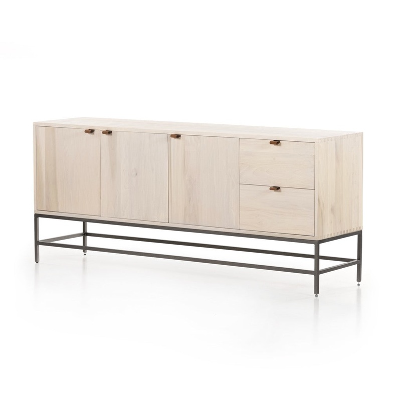 Inspired by clean midcentury design, a stylish sideboard of light-washed solid poplar offers plenty of storage space thanks to roomy cabinetry plus dual drawers. Metal-secured pulls of top-grain leather add a textural element of surprise.