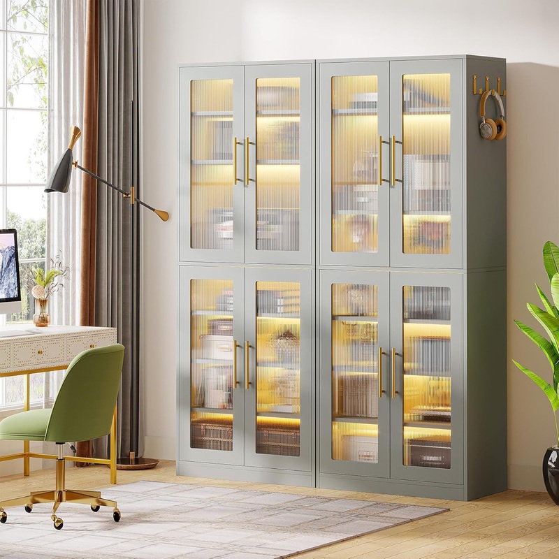 Bookcase with Doors & LED Light: This tall bookshelf is accented with an RGB LED light that allows remote-controlled color adjustments of the light strips. Coupled with an acrylic door and gentle lighting, it emanates an aura of openness and significantly