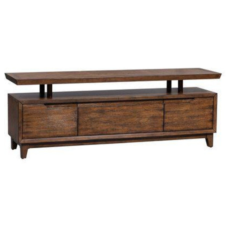 Combine mid century and modern styles to create the Venture Blvd 72 tv console. Crafted with rubberwood solids with cathedral walnut veneers, this piece accommodates most 75 TVs and features a bronzed spice finish with wire brushed drawer fronts, full exte