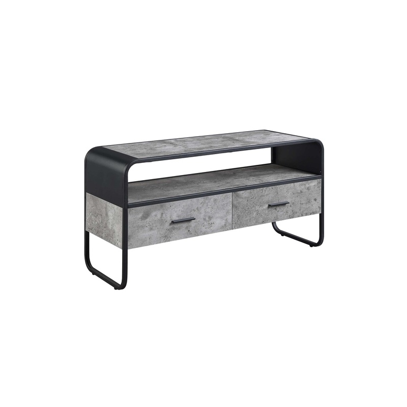 Bring a little Industrial style to the living room with this TV stand. This stand features a grey concrete finish, black metal frame, and a streamlined silhouette for the look of a modern Industrial style. Open shelves give you spots to display DVD players and often-watched DVDs, while two drawers lend even more space to stash your collection of entertainment accessories. It is sure to bring a striking decorative effect to your living room.
