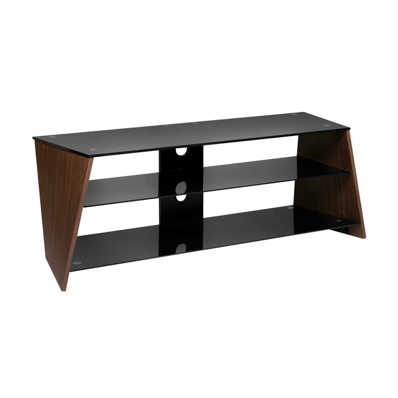 The contemporary and clean design of the 50-CBTVTWWN incorporates smartly styled bowed ends in a natural walnut finish. A black tempered glass top and two shelves nicely complement the look and add plenty of room for storage. The open shelf design allows r
