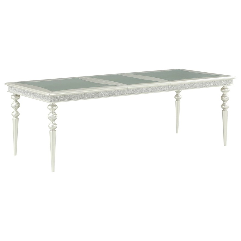 -Rectangular Table -Wooden Top -Sparkling Rhinestones Inlay -Wooden Frame -Wooden Turned Legs -Removable Extension LeafProduct ID198581173Manufactured ByDecor LoveSold ByDecor LoveSize/WeightW 88" / D 40" / H 30" / 161 lb.MaterialsEngineered Wood, MDFAssem