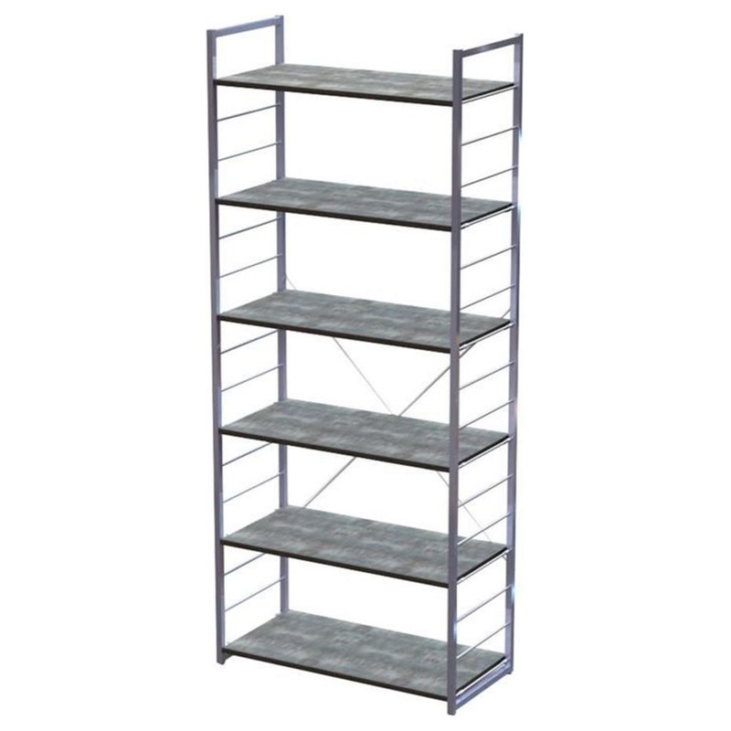 This bookcase creates a stunning place to store your books, decorative accents, and mementos it is exactly what you need to refresh your home office, family room, or den. The metal frame along with the dark finished veneers gives the bookcase its reclaimed