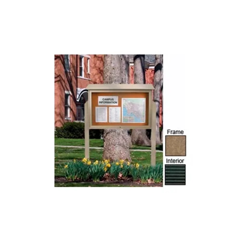 This Top-Hinged Single Door Message Center features a large door to display important messages. Letter board units include a 145-piece 2″ Helvetic letter/number set. Lockable door top mounted on a full length piano hinge (two keys included). Heavy-duty construction for years of use. Will not rot, splinter or crack with the high density polyethylene construction. Finished back panel looks great on posts and adds structural integrity. Removable interior surface. Posts optional – please order separately. Case Dimensions: 3/4″ wide main frame, 1-1/2″ wide door frame, 5-1/2″ exterior depth, 3-3/4″ interior depth, 8-1/2″ rain cover depth. Includes 1 top-hinged door. Black interior, Weathered Wood frame finish. 52″W x 40″H overall.