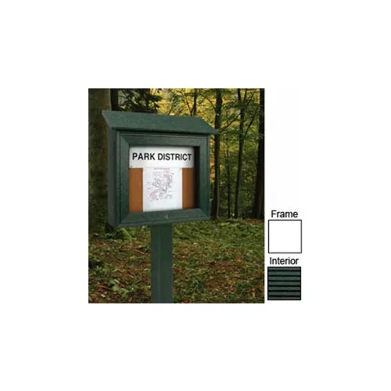 This Mini Message Center is great for university campuses, parks and golf courses. Letterboard units include a 290-piece 3/4″ Helvetic letter/number set. Lockable door top mounted on a full length piano hinge (two keys included). Heavy-duty construction for years of use. Will not rot, splinter or crack with the high density polyethylene construction. Finished back panel looks great on posts and adds structural integrity. Removable interior surface. Post optional – please order separately. Case Dimensions: 3/4″ wide main frame, 1-1/2″ wide door frame, 5-1/2″ exterior depth, 3-3/4″ interior depth, 8-1/2″ rain cover depth. Includes 1 door. Black interior, White frame finish. 18″W x 16″H overall.