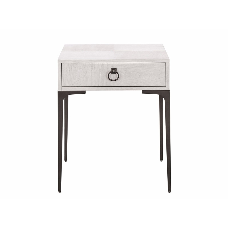 Slim and succinct, the Dahlia Drawer End Table provides a charming touch to any living space with its slender tapered legs, ring pull accent, and Dove finish.