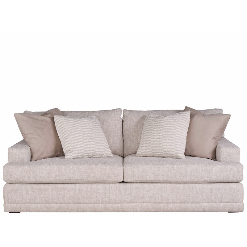 22″ pillows in Tahiti Parchment; 24″ pillows in Padme Taupe; With two cozy seat cushions, clean-lined armrests and boxed legs, the Hadlee Sofa is a down-to-earth living room furnishing.