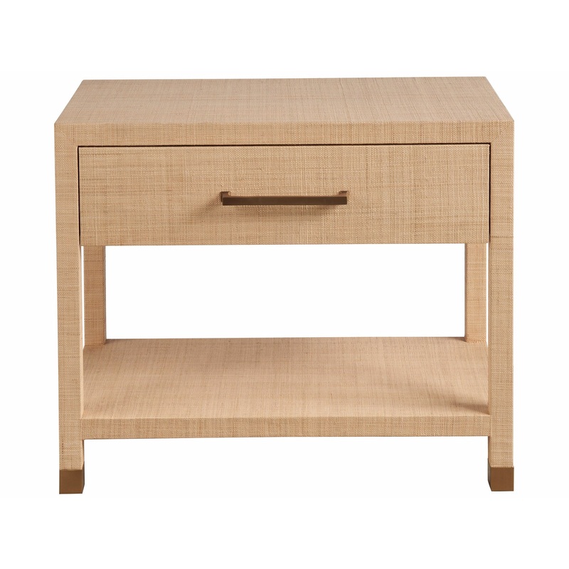 The Leah Nightstand, with its single drawer and full raffia-wrapped body, makes a textured statement in any bedroom. Bold bar hardware and leg accents add a touch of sophistication, enhancing the piece's rich texture and visual depth.