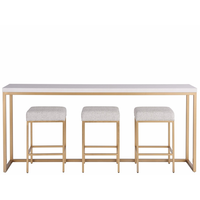 The Love Joy Bliss Console Table features a smooth tabletop in a chic Alabaster finish, which is accented by a soft gold metal base. Adding to its charm, this console table includes three upholstered accent stools, bringing additional comfort and convenien