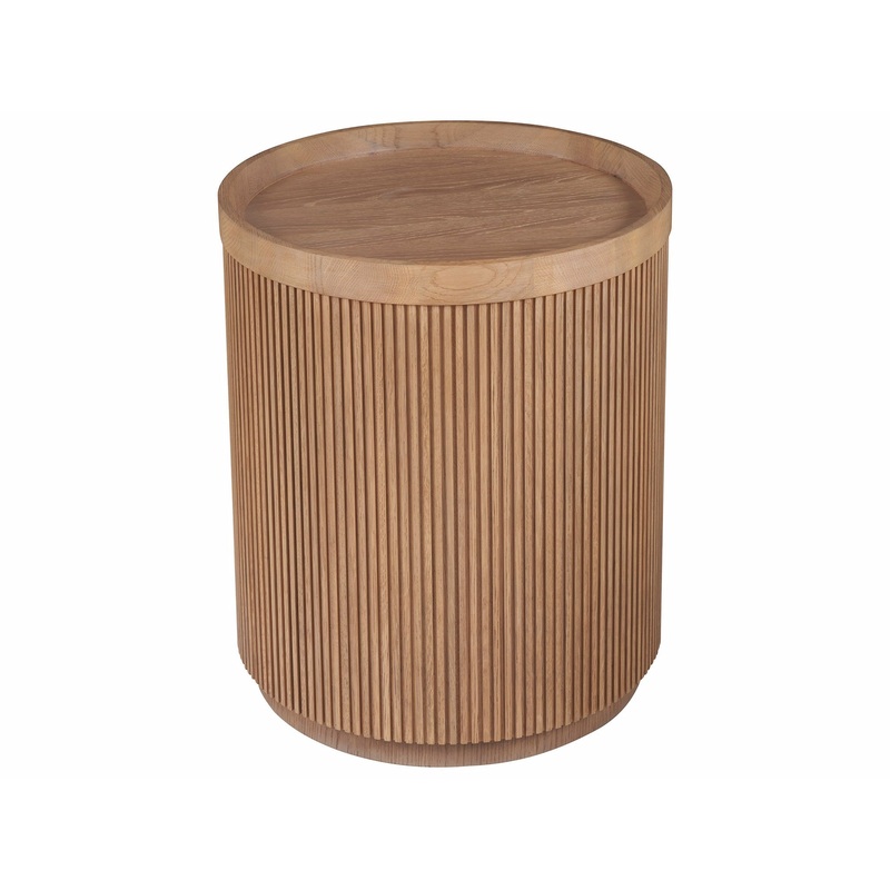 The Lumi Side Table, in a warm Natural Oak finish with a tambour-wrapped base, presents a perfect punctuation to any seating arrangement. Its exquisite ridged detailing infuses spaces with a simplistic organic charm, complementing chairs or sofas with a su