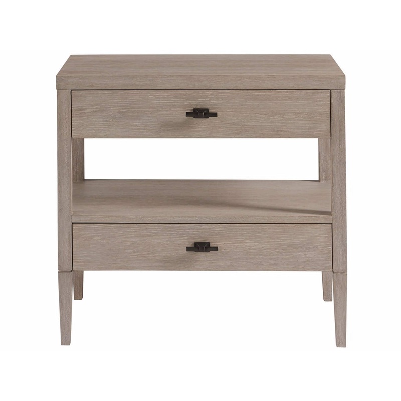 Built with an open display area and two spacious drawers, the Midtown Nightstand is defined by a regal Flannel finish and is accentuated by two Dark Pewter bar hardware pulls.