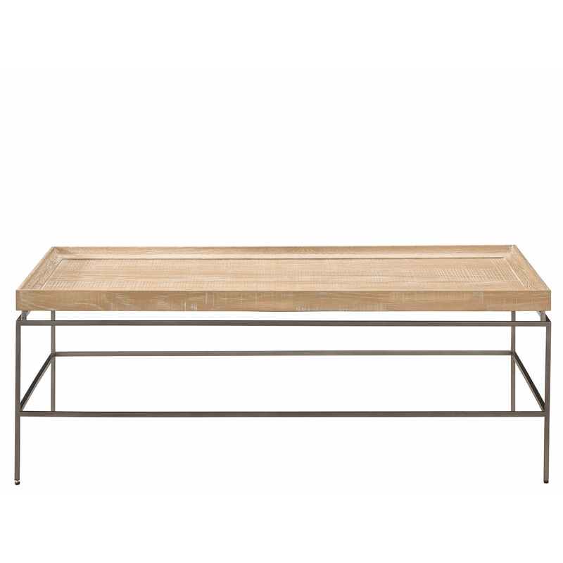 The pairing of a tabletop with a rustic natural oak finish and a sleek metal base defines the Preston Cocktail Table, a simple yet chic living room furnishing.