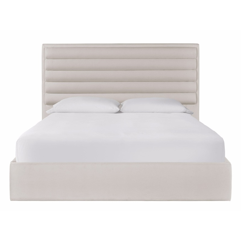 The Tranquility Upholstered Bed displays a soft and welcoming silhouette, featuring a backboard of rolled, upholstered accents framed by an elegantly understated bedframe.