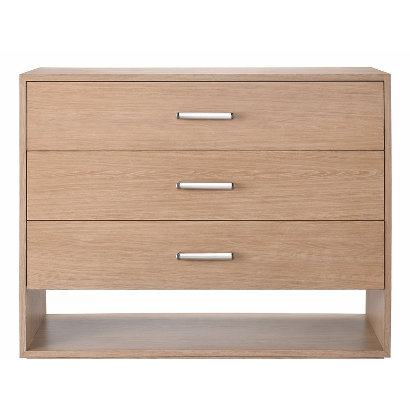 The Vista Dresser will accentuate bedroom areas with both style and function, featuring three spacious drawers, a lower open-air shelf, and a dynamic pairing of an oak finish and modern bar hardware.