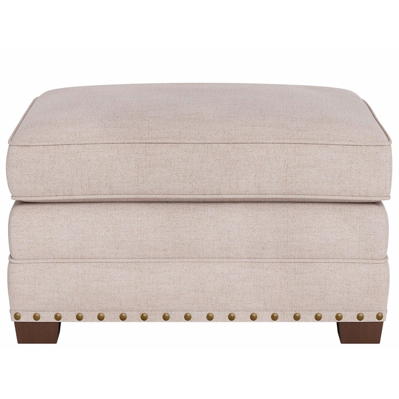 Equally appealing styled alone or with the Riley Chair, the Riley Ottoman showcases a plush upholstered body cradled by boxed legs and completed with nailhead trim.