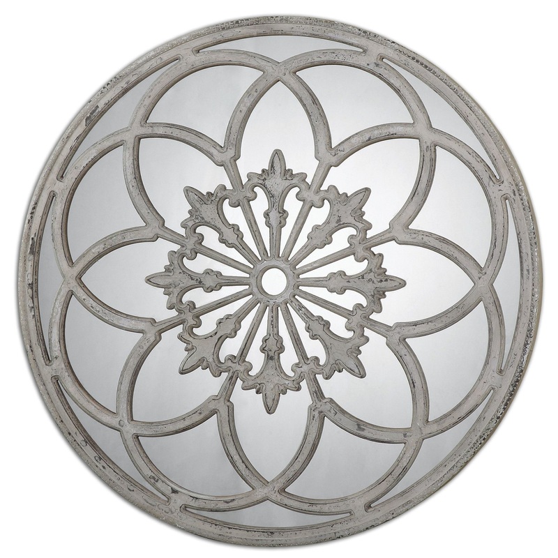 Features: Ornate, heavily distressed, aged ivory finish with rust bronze undertones Pizzelle inspiration Fleur de lis accents Large statement mirror Mounting hardware included Specifications: Depth: 2.125 Frameless: No Height: 39.75 Lighted: No Mirror Front: Flat Mirror Shape: Circle Product Weight: 46 Projection: 2.125 Width: 39.75