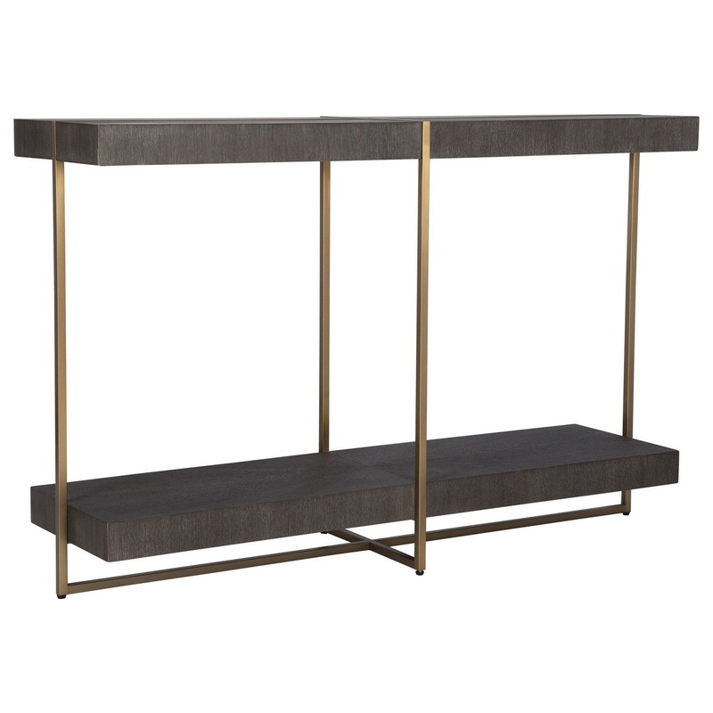 Contemporary In Style, This Console Table Features A Stainless Steel Framework Finished In A Brushed Brass With A Starburst Acacia Veneer Top In A Dark Walnut Stain Washed With A Light Gray Glaze. Console Table from the Taja collection in Brushed Brass finish