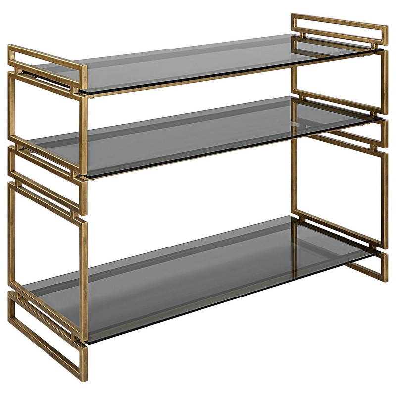 -Console Table from the Stacked Up collection in Antiqued Gold finishA Functional Accent That Allows For Creativity As Entryway Piece Or Even As A Bar. Features A Striking Combination Of Smoked Gray Glass With Geometric Iron Supports Finished In Lightly Antiqued Gold.