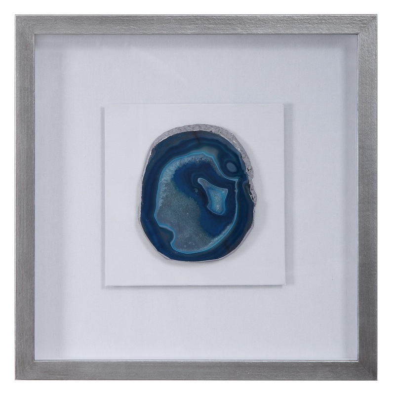 A Pine Wood Shadow Box Featuring A Hand Applied Silver Leaf Finish Showcases A Striking Blue Agate Stone With Light Blue Veining, Accented With Hand Painted Silver Edging. Mounted On A White Linen Backing. Model # (MPN)4226Product ID177651127Manufactured B