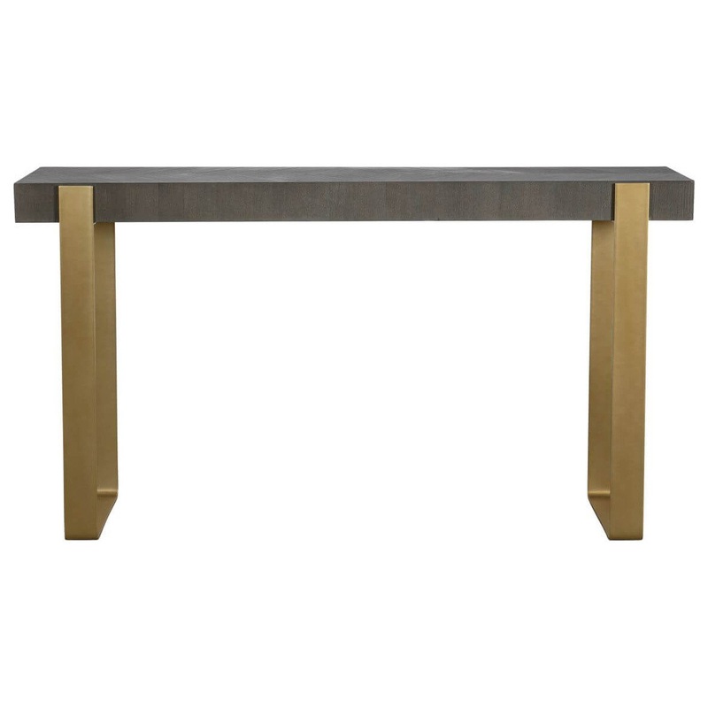 Contemporary In Style, This Console Features A Striking Diamond Ash Veneer Top In A Dark Walnut Stain With Light Gray Glazing. The Iron Strap Legs Are Finished In A Warm Brushed Brass. -Design Information -Product Style : Transitional -Material : MDF, Ash