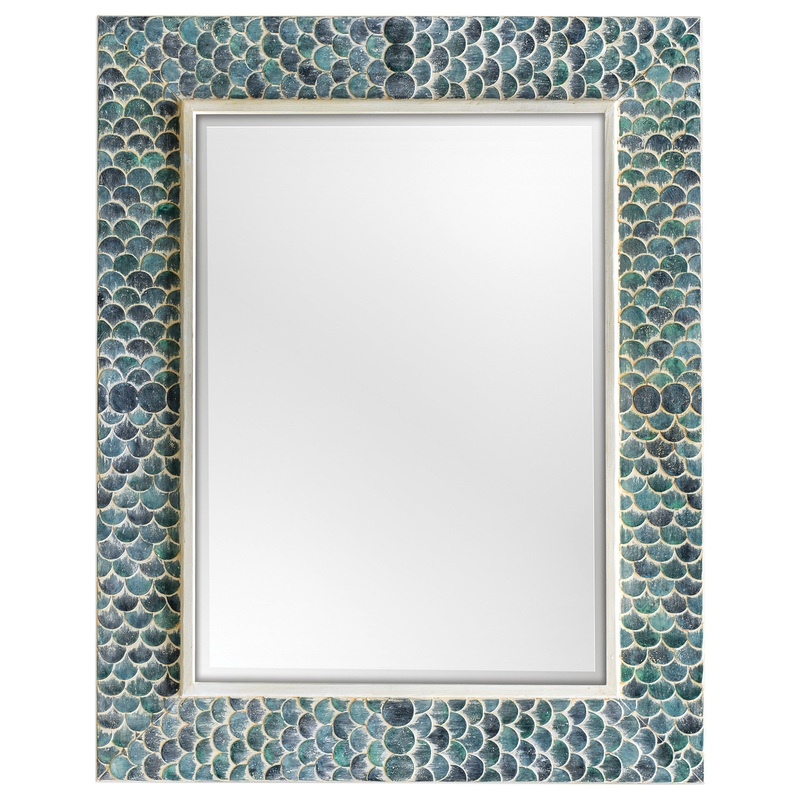 This Unique Design Takes A Whimsical Approach By Adorning A Solid Wood Frame With Fiber Glass Mermaid Scales, Hand Painted In Shades Of Tropical Blues, Accented With A Heavy White Wash. Mirror Is Beveled. May Be Hung Horizontal Or Vertical. Model # (MPN)81