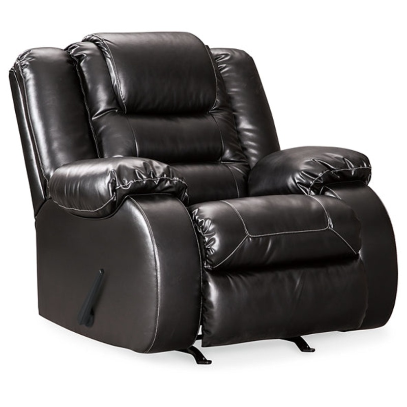 When it comes to comfort, style and value, this faux leather rocker recliner in black rocks. Tailored for feel-good flair, its fashion-forward bustle back design is enhanced with sculpted padding on the headrest for cradling support. Channel cushioning along the sides flows into thick, wrapped pillowtop armrests that are truly over the top. And while it might look like you broke the bank, a sumptuously soft leather-like fabric keeps indulgence well within budget.