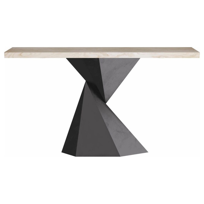 Sleek and modern, our valder console was inspired by the tight paper folds in origami and reimagined as a twisted, faceted, blackened-bronze iron pedestal base with a high-contrast smoke oak top. Finish will vary. -Industrial Style -Finish: Smoke -Primary