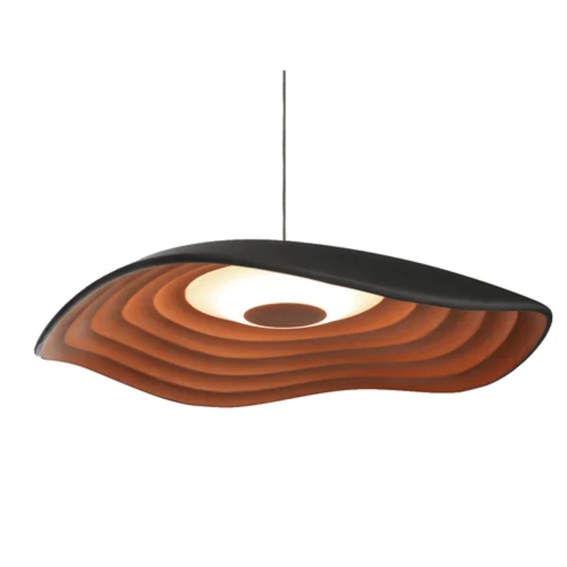 The concept of this lamp is based on a smooth head which draws a wavy shape on its perimeter, the clear contrast with the lamp inner part, that reminds us of the gentle and small oscillations that marine currents form on the Mediterranean coast.