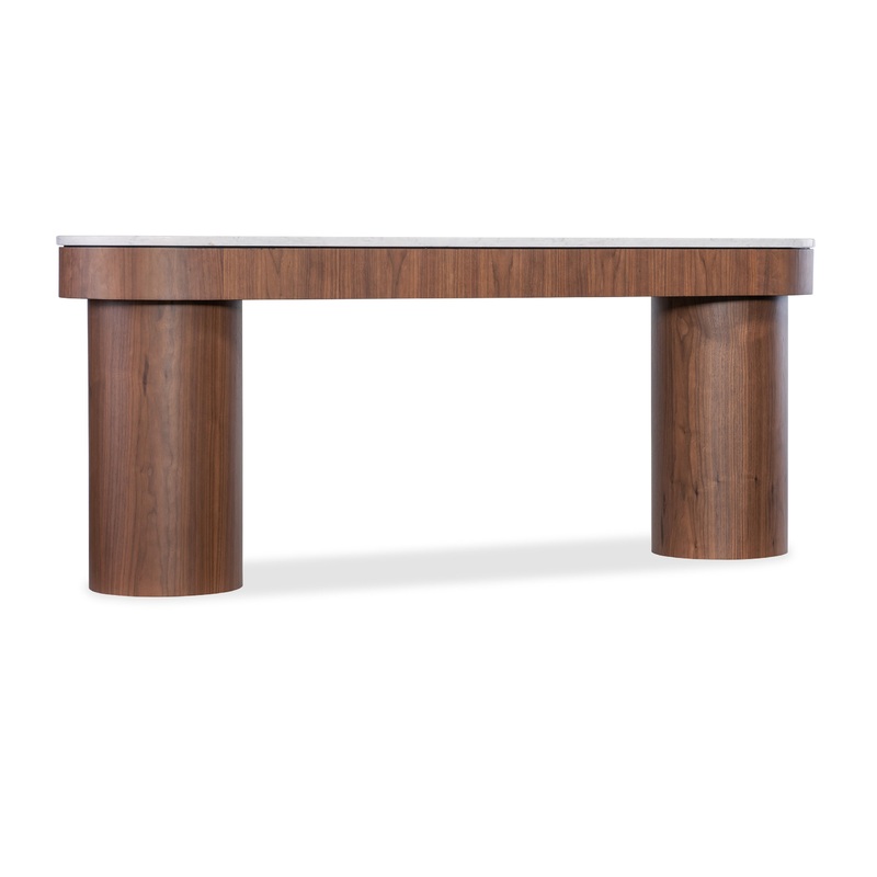 Natural luxury meets a relaxing silhouette in the Vana Console that combines a medium wood finish on Walnut Veneers with a marble top featuring warm white colors with touches of gray and soft gold veining throughout the natural stone. The narrow shape and double round pedestal legs give a timeless appeal. Measures 68 inches wide by 16 inches deep.