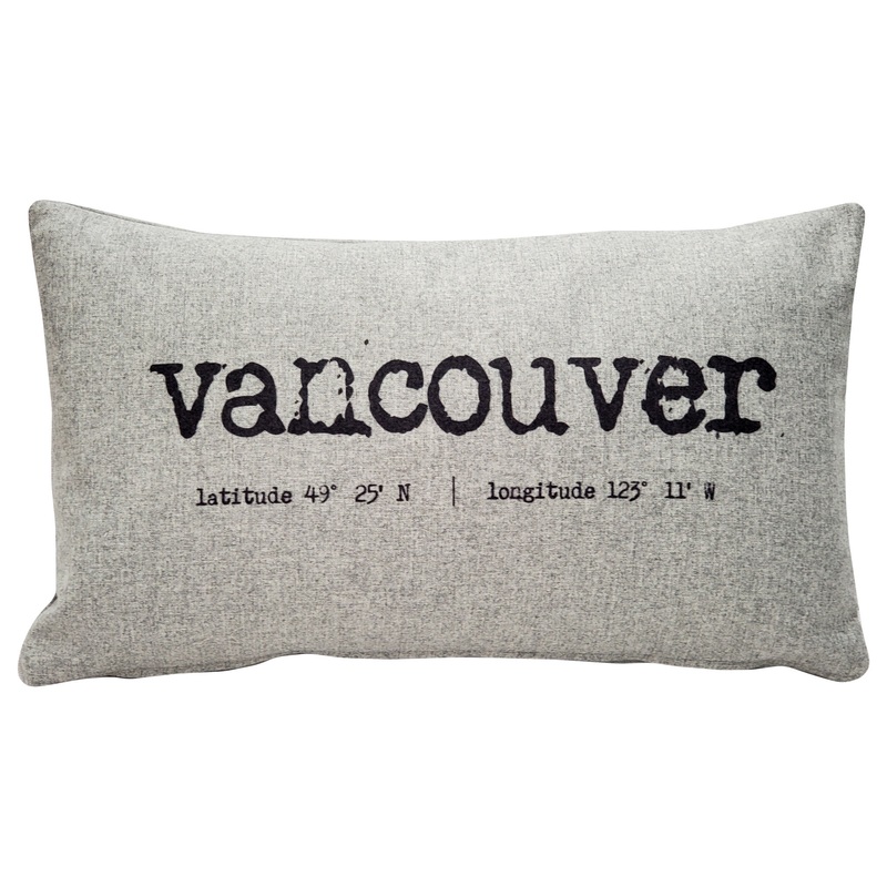 Vancouver and its geographic coordinates are printed across this throw pillow in an old typewriter typeset. The gray-taupe font contrasts nicely against the light gray felt fabric giving the pillow a beautiful vintage look and feel. The Vancouver Coordinates Pillow is a perfect size for a stand alone chair in a den, office, or living room or would make a nice finishing touch on a bed or window seat.. FEATURES: