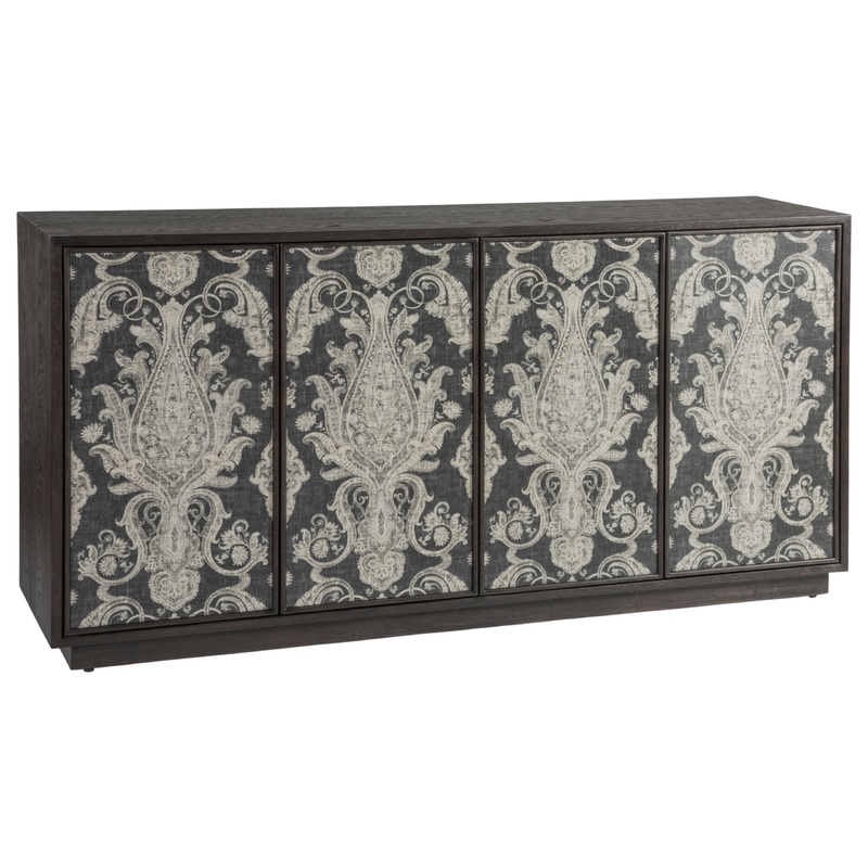 Contemporary design crafted from select hardwoods and flat-cut oak veneers in a heavily sandblasted rich mocha brown coloration with a satin sheen. Features four wood framed fabric covered doors, four adjustable shelves, a ventilated back, and a recessed plinth base.