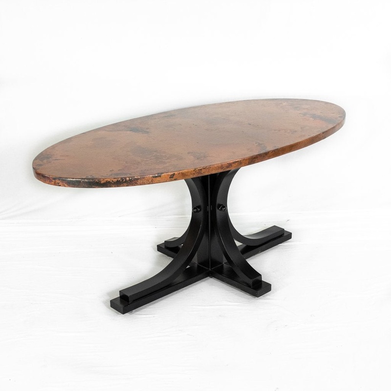 The Vestal Oval Dining Table is a new addition to the Vestal line and an update to the original. The oval tabletop adds a curve in the top to match the base and create an elegant style for any space. The pedestal style base has dimensions that are modified to match and support the elongated copper top, while still providing a maximum amount of leg room for your guests. A black powder coat finish is applied to the base for a more modern appeal and extra durability. There is a reason the Vestal is our best selling table base.