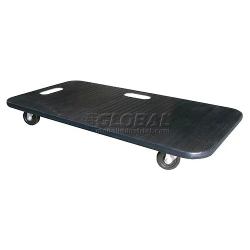 Suitable for moving office furniture, products around factories and equipment around jobsites, this dolly is built to last. Dolly is constructed of a heavy duty fiberwood deck with a padded rubber cover that protects and grips the load. PVC edge-strip surrounds the deck to help protect walls from damage. Twin hand holes in each dolly help when carrying between workstations. Smooth rolling swivel casters allow the dolly to be turned in its own radius. Shipped assembled.