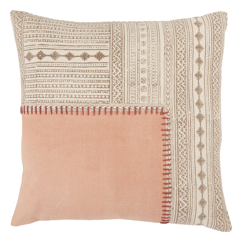The Amulet collection boasts fresh color palettes and intricate tribal details for a global statement in contemporary spaces. The Ayami throw pillow features a textural tribal and color block design in soft colors of light pink, cream, and light taupe. Embroidered stitch details lend eye-catching appeal to this versatile yet pattern-rich cotton accent.