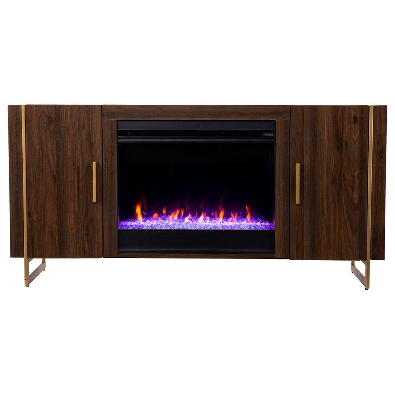 Modernize your fireplace experience this low-profile fireplace console. A spacious mantel easily displays Decor items or your flat screen TV, while two cabinets neatly tuck away movies and spare cords. Color changing flames reflect off faux crystals to giv