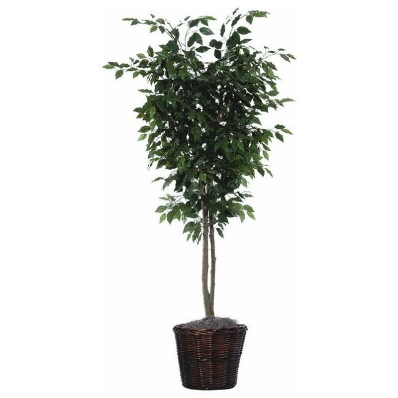 Vickerman 6′ Ficus Deluxe Tree natural hardwood trunks. Potted in dark brown rattan basket with excelsior.