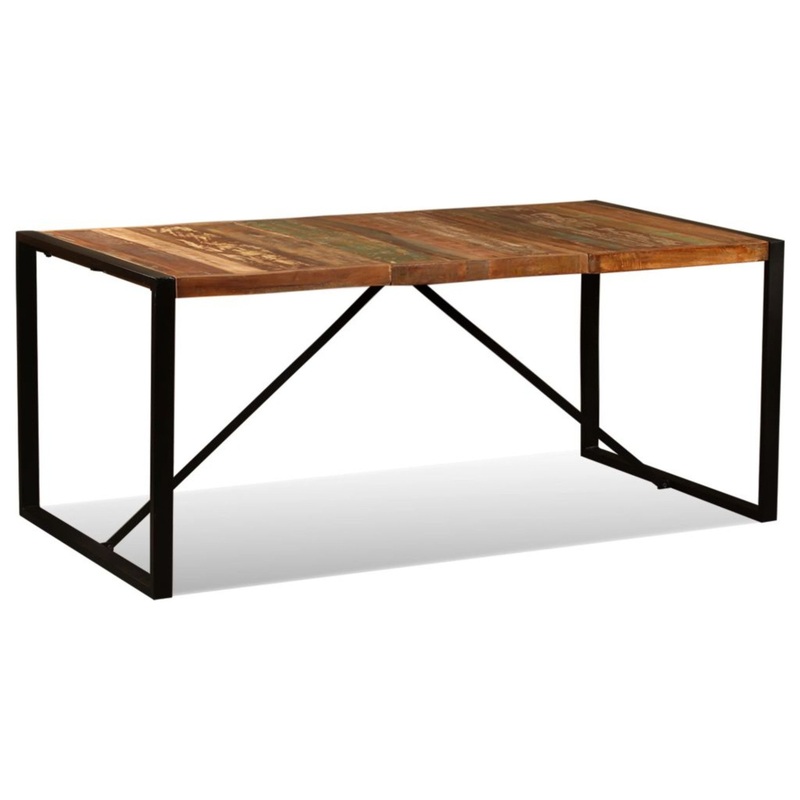 vidaXL Dining Table Solid Reclaimed Wood 70.9″vidaXL Dining Table Solid Reclaimed Wood 70.9″ – 243999, This striking wooden dining table in the industrial style will make a distinctive addition to your kitchen or dining room. This dinner table is made from solid reclaimed wood, which means that it has the characteristics of different woods like Sheesham, Teak, mango wood, Acacia, etc. Reclaimed wood is solid, stable, durable, and beautiful. Signs of wear and craftsmanship give each piece a unique look and add to its spectacular vintage style. The steel legs complete the industrial look. Every step of the process is carried out with the greatest care, be it polishing or lacquering. Assembly is easy. Important note: The color may vary from piece to piece, making each of our dining tables unique; the delivery is random.