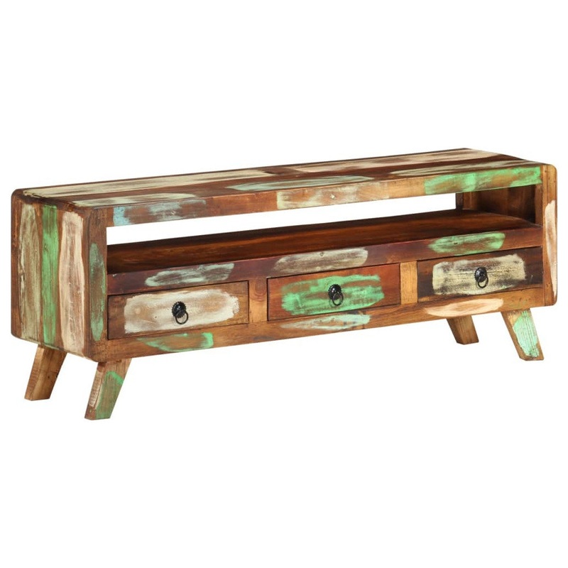 This stylish TV cabinet is very practical and it will make a great addition to your living room or bedroom. The TV stand is made from solid reclaimed wood, a combination of reclaimed timbers including teak, mango wood, pinewood, beech, etc. These woods are recycled from old buildings such as factories, sheds and boats. This makes it a fantastic environmentally friendly option in furniture making. As every piece is handmade, colors vary with many blues, greens, creams and sometimes oranges, reds and pinks shades revealed. This even means each one is unique! Additionally, it is equipped with 3 drawers and 1 shelf, which provide ample storage space for your personal belongings. Important note: Colors vary from piece to piece, making each piece unique. The delivery is random, ensuring the exclusivity and individuality of your product.