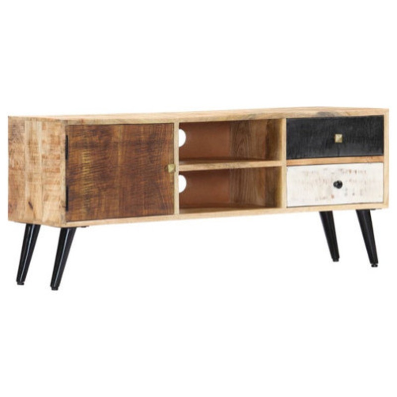 This wooden TV stand with mid-century style will become the focal point of your living room or entertainment area. It can also be used as a sideboard, side cabinet, hifi cabinet, etc. The TV cabinet is handmade of mango wood which is solid, stable, durable and beautiful, and the craftsmanship adds to its spectacular retro style. Every step of the process is carried out with the greatest care, be it polishing, painting or lacquering. The craftsmanship and the beautiful wood grains make every piece of furniture unique and slightly different from the next. The 2 compartments, 1 door and 2 drawers provide ample space for you to keep your DVD player, game console, streaming device and media carrier tidy and organized. The cabinet is easy to assemble. Important note: The colors and grains of the wood may vary from piece to piece, making each piece unique and slightly different from the next. The delivery is random, ensuring the exclusivity and individuality of your product.