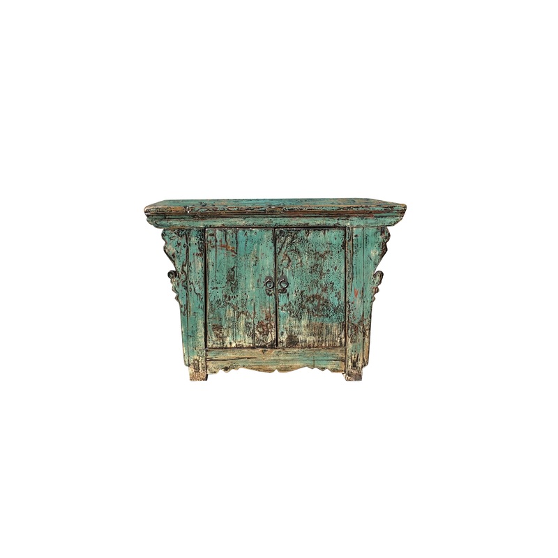 This is a low, antique-style wooden cabinet with a heavily distressed, rustic finish. The cabinet is coated in a faded teal paint that has peeled and chipped in numerous areas, exposing the natural wood grain and undertones of brown and white beneath, giving it a weathered, timeworn appearance. It features two doors, each fitted with a simple, dark metal pull ring, providing access to the interior storage space. The sides of the cabinet are adorned with subtle, carved detailing that adds a touch of traditional craftsmanship, while the top edge has a slightly scalloped design, enhancing its vintage charm. The cabinet sits on short, sturdy legs with a gently curved base, contributing to its classic silhouette. This piece exudes an old-world, rustic aesthetic, making it an ideal choice for adding character to a farmhouse, bohemian, or eclectic interior as a small console, storage cabinet, or accent piece.