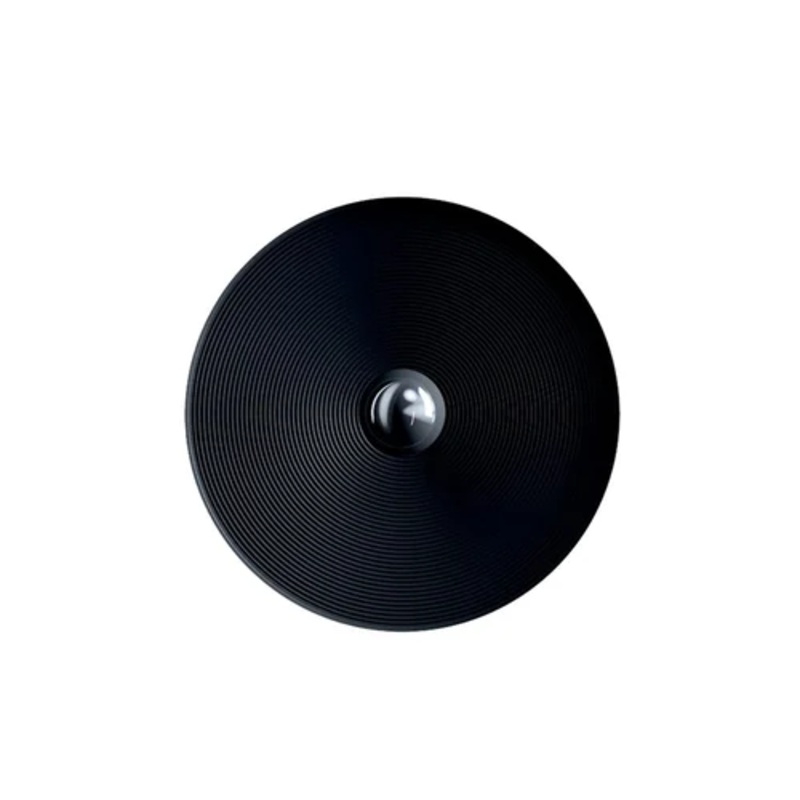 An extremely graphic lamp, Vinyl is made up of a metal surface with an engraved circular pattern similar to a vinyl record that seems to emulate sound vibrations while breaking down the light in a way that is captivating to the human eye. Vinyl is a versatile suspension and wall lamp in turned metal, also perfect as a suspension element. It is available in two sizes, 60 and 32 cm in diameter, and two finishes: silver and deep black. For the wall and suspension variants, we recommend the use of shielded cap bulbs for an indirect light effect that grazes the surface, which will seem to vibrate.
