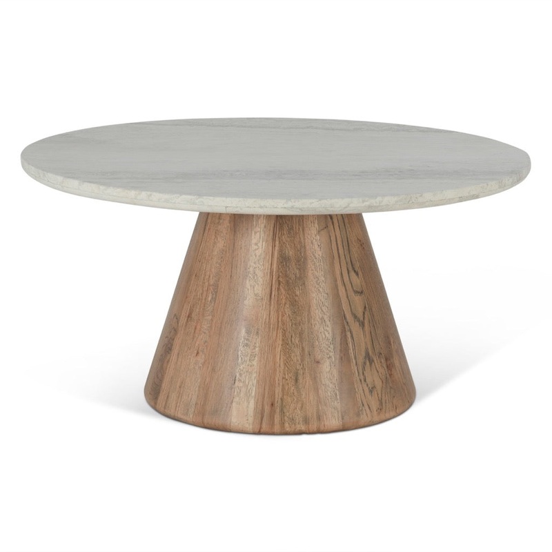 The Vista Coffee Table features a luxurious white travertine top paired with a sleek light oak base. Its modern design and natural materials create a sophisticated yet warm look, making it a perfect centerpiece for any living room. The combination of stone