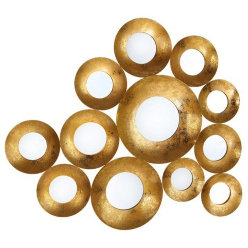 -Featuring a distressed golden finish and beveled frames, these twelve multisized mirrors come together to create a stunning piece.