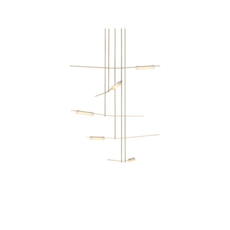 Volant 555 chandelier by Ross Gardam is a sculptural lighting piece in treated brass and glass, designed with modular precision.