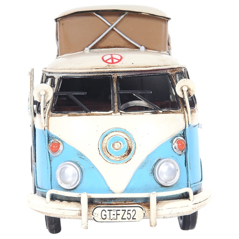 This little cute camp bus is the accurate scale replica of the famous car Volkswagen split windshield Kombis which were built between 1950 and 1967. This automobile model is 100% iron frame with metal, rolling wheels. The decal insignia and painted details give more of an authentic look. The model has seats as well as a steering wheel and minor details on the dash. Other interior details include camping gear and a table in the rear. The exterior details, such as the spare wheel, are securely welded on. When shipped, the item is packaged with foam inserts banded to pieces of cardboard to keep them held sturdily in place. ;100% iron frame;Metal wheels; Wheels roll; Painted and decaled insignia;Includes details such as seats, steering wheel, and gas pedal.; Exterior details are securely welded on; 100% iron frame