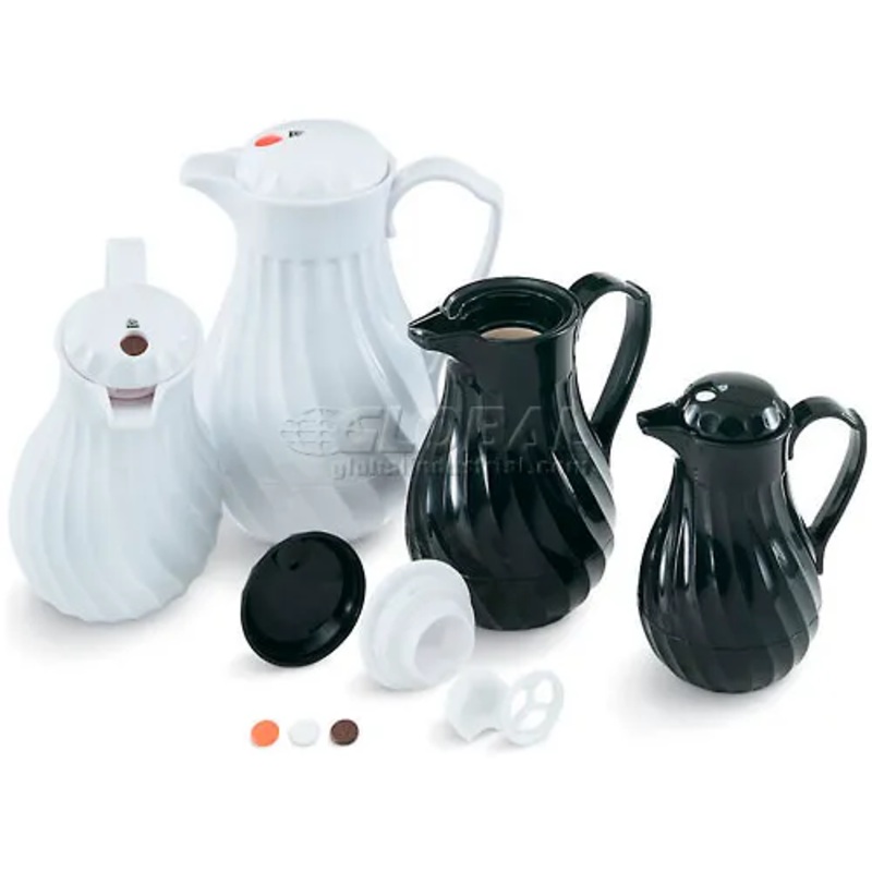 SwirlServe insulated server keeps beverages hot or cold for hours. Customer customization, exclusively available from Vollrath, easily identifies decaffeinated and regular coffee and other drinks like milk or tea.Not for use in microwave. NSF certified pouring system lets you pour without pressing buttons. Self-closing spout disassembles for easy cleaning. Orange, brown, and white tabs allow for easy differentiation. Durable polycarbonate inner liner is odorless and stain resistant. Polyurethane insulation in body and cover. Exterior looks like porcelain but is actually impact-resistant plastic. Additional Tilt & Pour covers available. Hand wash only. 42 ounce capacity. Sold in package quantity of 12. Priced each.