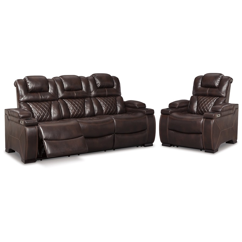 Your modern living room awaits with this power reclining upholstery package. Complete with practical faux leather beautified with diamond lattice stitching, one-touch power controls, adjustable headrests and USB charging ports, it makes finding the best se