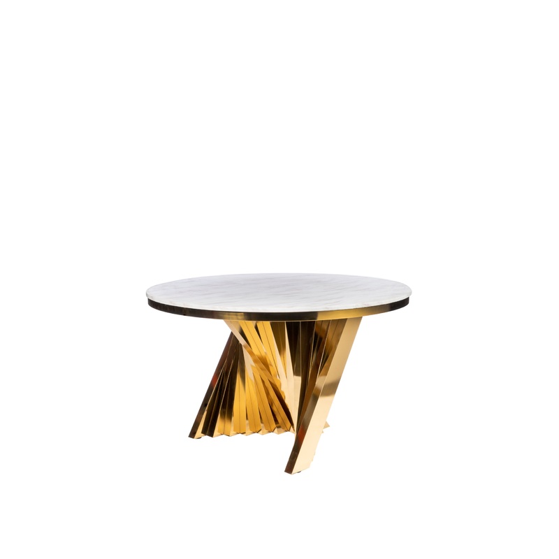 Sophisticated materials take a cue from modern geometry. Golden stainless steel forms uniquely curved angles to balance a contrasting polished white marble top. A refined spin on trend-forward design.